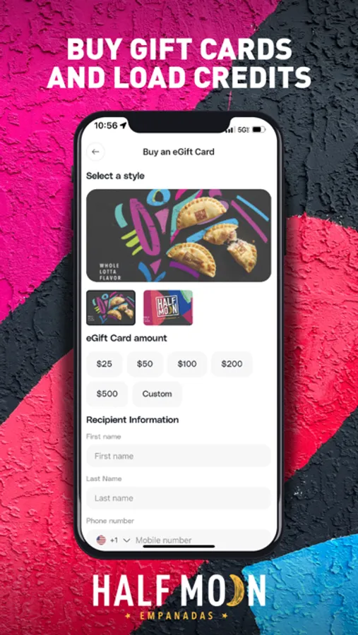 Share the love with a digital Half Moon Empanadas Gift Card in the app or via messaging. It's easy to redeem a digital card from email or in the Half Moon Empanadas app.