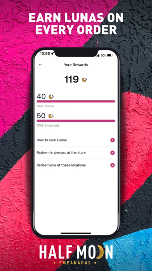 Save time and earn Lunas when you pay with the Half Moon Empanadas app at participating locations across the U.S.