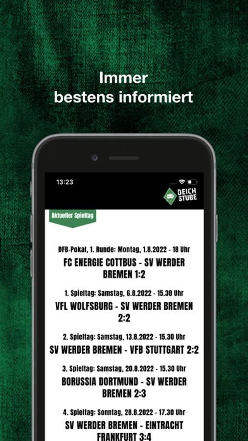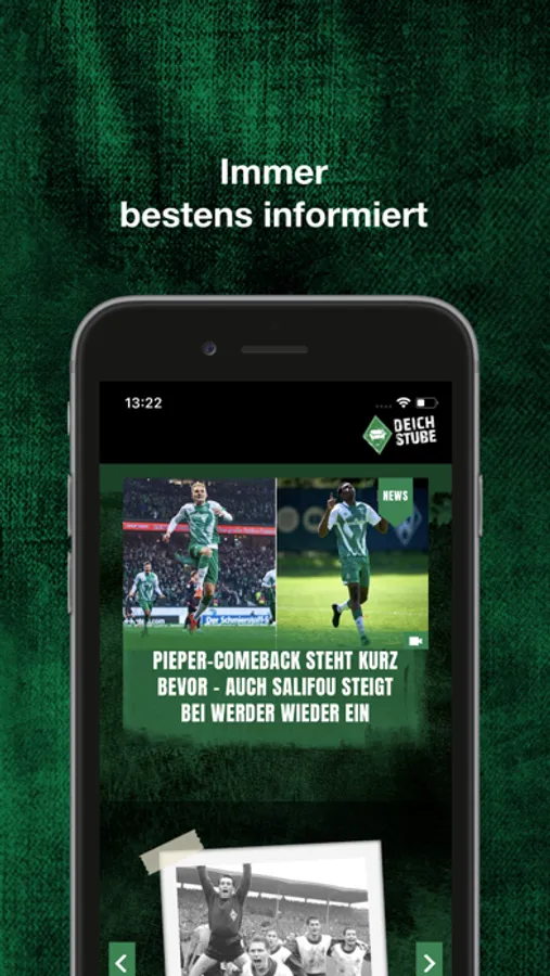 Das Multimedianetzwerk begleitet den Fußball-Bundesligisten rund um die Uhr und informiert die User journalistisch unabhängig und fundiert, aber auch mit einem hohen Unterhaltungswert in Wort, Bild und Video. Die DeichStube- App liefert die umfangreichste Berichterstattung über den SV Werder Bremen direkt aufs Smartphone: News, Hintergrund-Berichte, Videos, exklusive Interviews, Fotos, Podcasts und Live-Content - alles, was der Werder-Fan braucht. Damit wird die DeichStube-App auch an Spieltagen zum perfekten Begleiter - ob im Stadion, unterwegs oder als Second-Screen vor dem TV.
