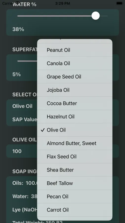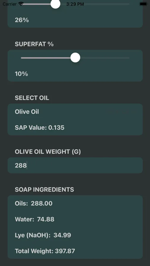 Adjust water and super fat % sliders and your recipe is adjusted automatically.