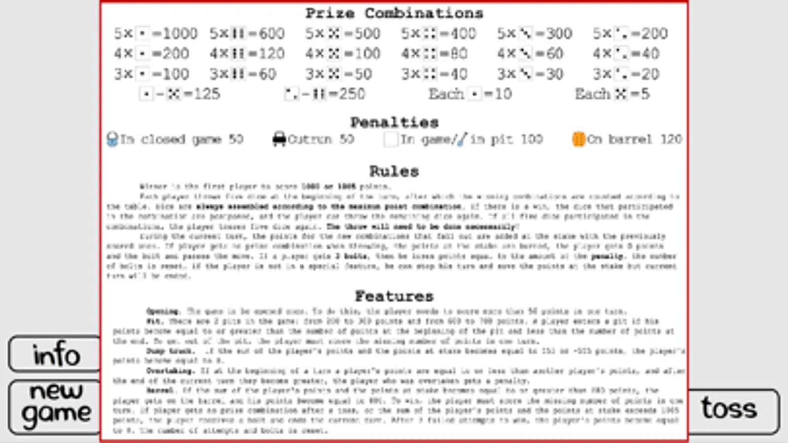 Up to 4 players participate, who take turns. The winner is the one who gets 1000 or 1005 points first.