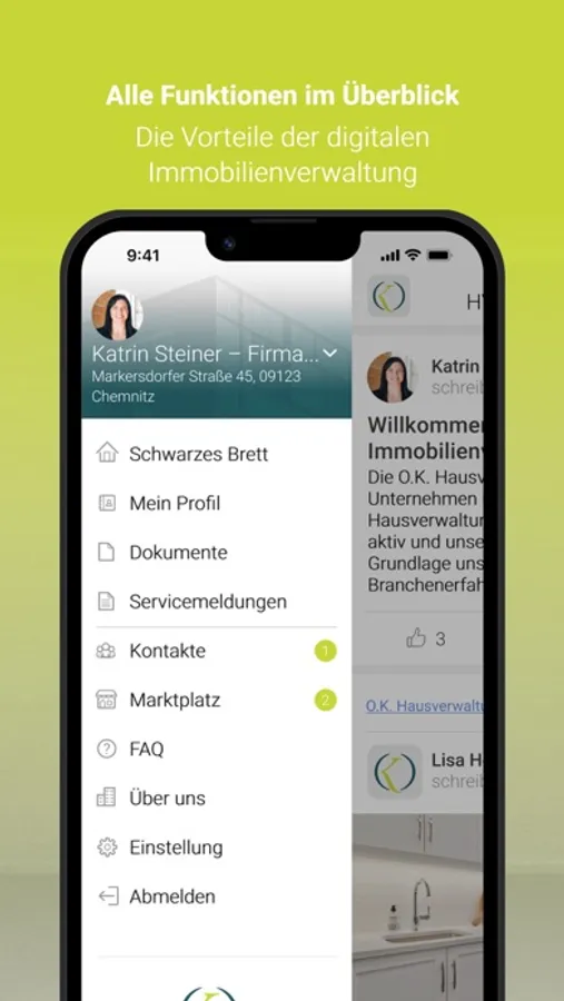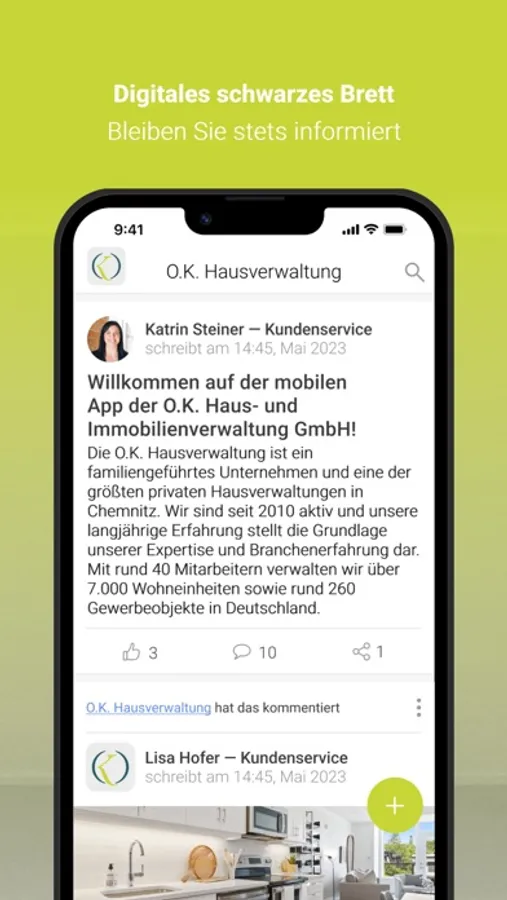 Als Kunde der O.K. Haus- und Immobilienverwaltung GmbH profitieren Sie von einem besonders innovativen Kundenservice, der Ihnen viele Freiheiten bietet. Mit der O.K. Hausverwaltung App können Sie uns rund um die Uhr Anliegen und Schäden inklusive Fotodokumentation per Smartphone melden. Zusätzlich stellen wir Ihnen eine digitale Dokumentenmappe mit wichtigen Dokumenten für Ihre Immobilie(n) zur Verfügung. Über das digitale schwarze Brett informieren wir via Push-Nachricht proaktiv über wichtige Informationen rund um die uns anvertrauten Immobilien.