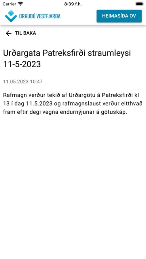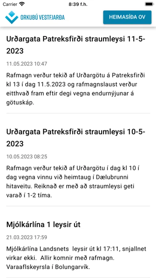 Allar tilkynningar varðandi bilanir og aðrar aðgerðir tengt Orkubúi Vestjarða og Landsneti á vestfjörðum.