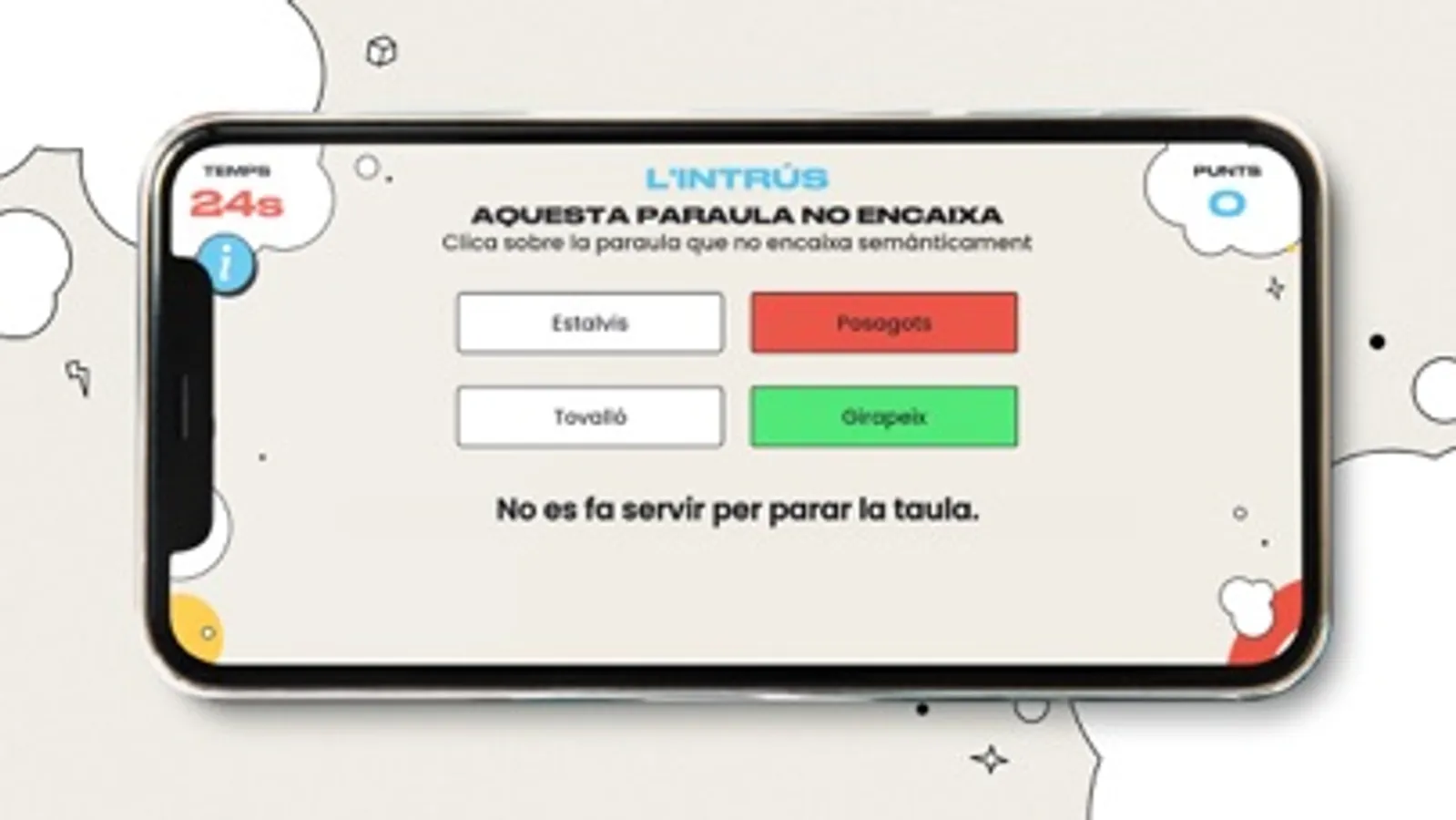 L'intrús, que inclou 3 minijocs: El barbarisme, L'errada oculta i Aquesta paraula no encaixa.