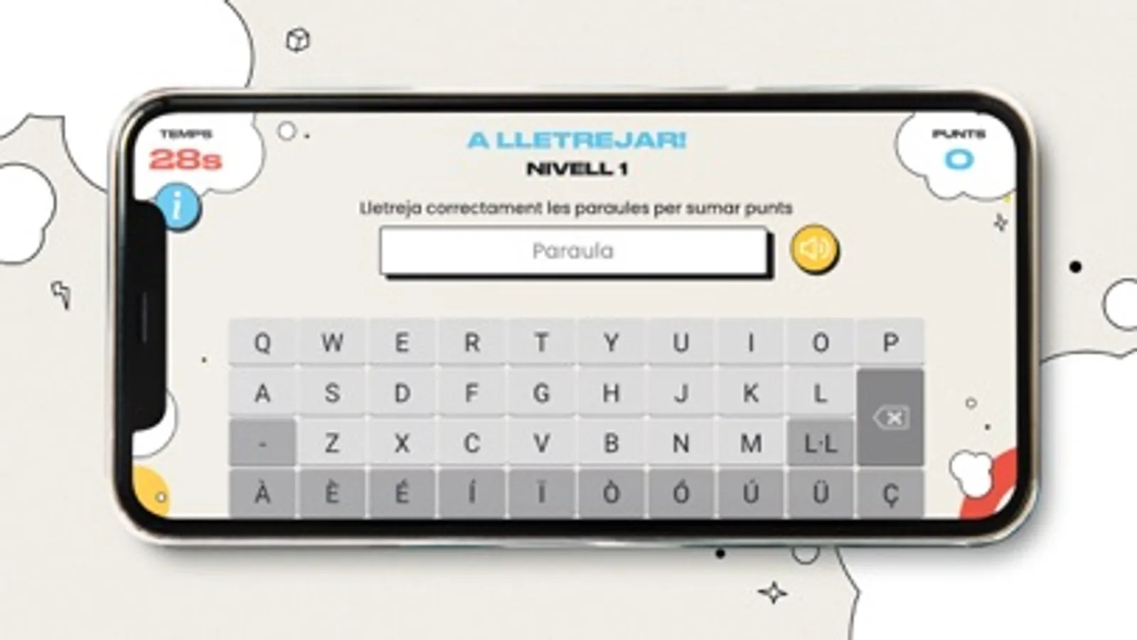 A lletrejar! En aquesta prova, l’usuari ha d’escriure amb el teclat que apareix en pantalla les paraules que se senten. Hi ha 3 nivells de dificultat creixent.