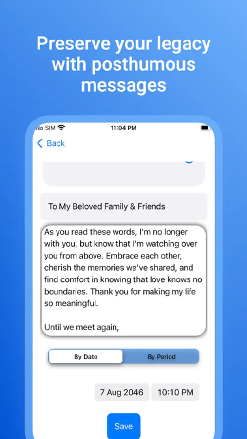 Scheduled Delivery: Control when your messages are sent. Choose to have them delivered after a specific period following your passing or on a designated date. Your words will find their way to the right hearts at the right time.