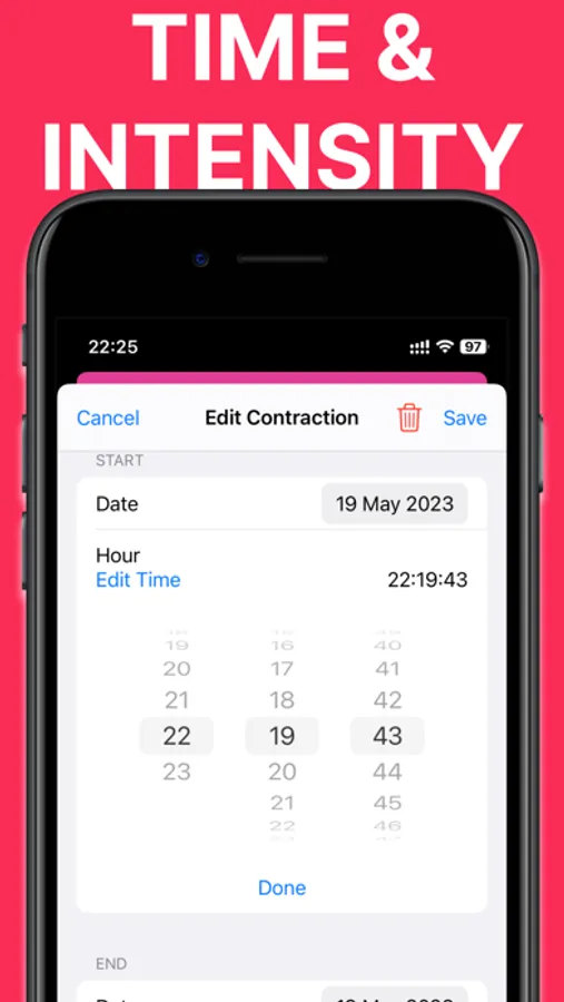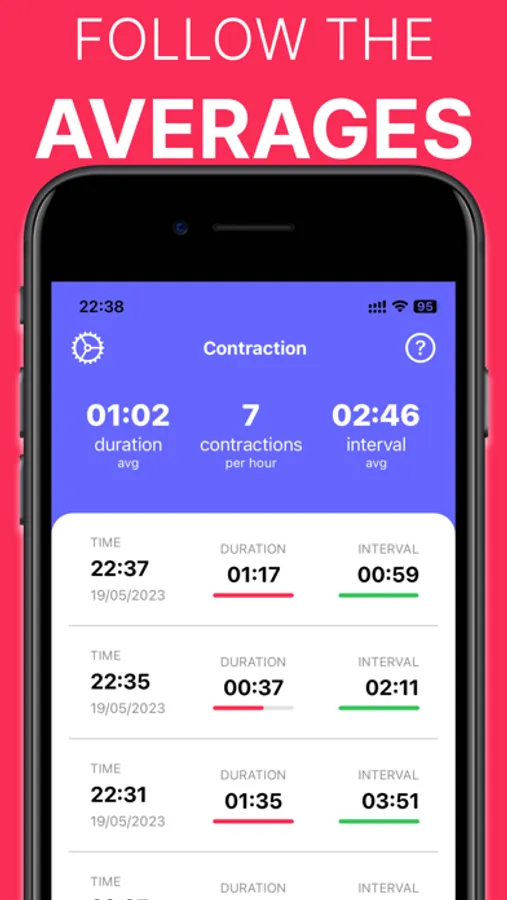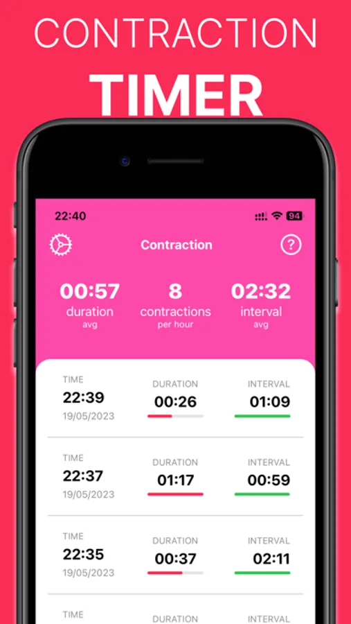 - View your complete contraction history on a single screen. Intervals are clearly displayed between contractions.