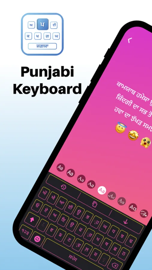 Easy and fast Punjabi typing is the first priority of this Punjabi Keyboard. Besides direct Punjabi typing pad, it also supports phonetic avro style typing. This keyboard helps you typing Punjabi very fast with Punjabi letters with A = punjabi latter .