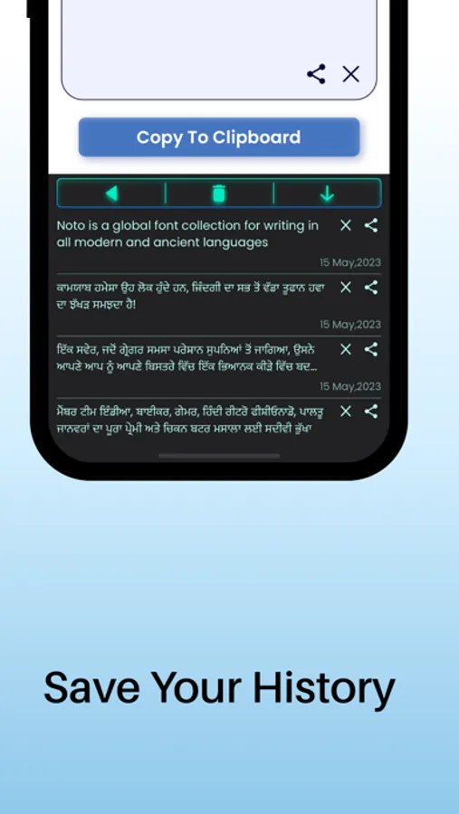 You can save your Punjabi text inside application it self. You can use your text for later use too.