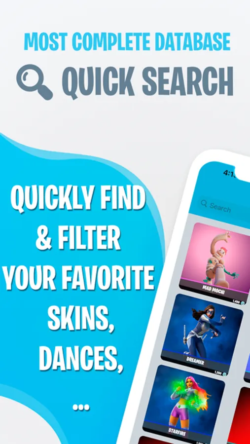 ·· Quick Search & Rarity Filter. Search engine to quickly find your favorite items, costume or dance easily within our database with more than 1.700 skins, 700 emotes and more than 10.000 cosmetic. Browse all category items (costume, gestures, weapons skin, pickaxes, …) without getting into the game.