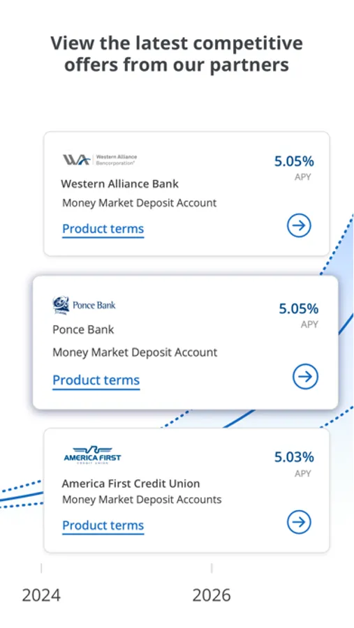 • Choice: Savings products from our partners offer flexible terms and some of the most competitive rates on the market. Use our platform to design a customized savings strategy that allows you to lock in top rates for longer terms while retaining liquidity on funds you may need sooner.