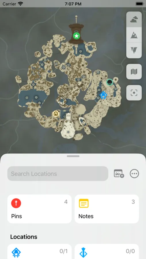 At the center of the app you'll find a map of all levels of Hyrule. You find markers for Shrines, Towers, Villages, Stores, Korok Seeds, Lightroots, Treasure Chests, Minibosses, and many more interesting locations. Tap and hold the map to add your own custom pins to the app as well.