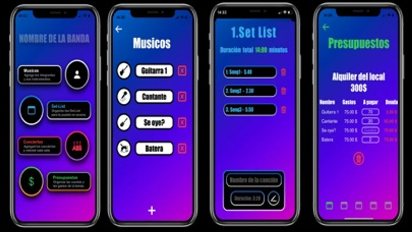 La aplicación permitirá a los usuarios crear y administrar su banda de rock, asignando roles. Los usuarios podrán crear eventos de conciertos, y asignarlos a diferentes ubicaciones y fechas. Además, podrán crear listas de canciones y set lists para cada concierto y ensayo.