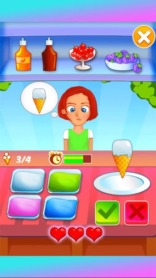 Ice Cream, Please! is a restaurant simulation game. In this game, you are the owner of a small ice cream shop. Combine flavors, toppings, fruits and nuts to create the perfect order for your customer. Tap on the ingredients to prepare the type of ice cream your customer wants, and tap the green checkmark when you're done. The faster you are, the more points you will earn. Get ready to become the owner of the most famous ice cream shop in town!