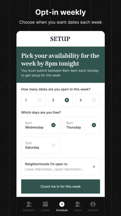 Once accepted, members have the option to purchase a 1 or 3 month auto-renewing membership and will have full functionality of the entire service while their subscription is active. SETUP's community values - trust, respect, and privacy - are core to the membership experience. Members who act in a manner that is not reflective of these values and other community guidelines may have their accounts suspended or terminated. Similarly, SETUP exhibits those values as a company by giving members full control over their visibility within the community at all times and ensuring that personal information is secure and never shared.