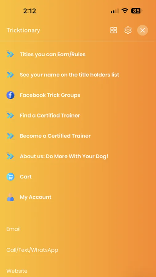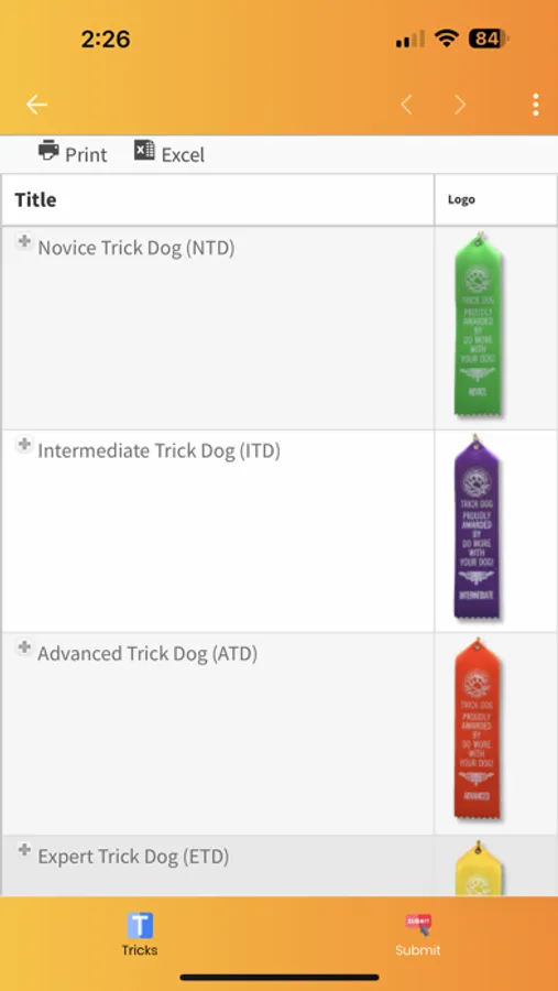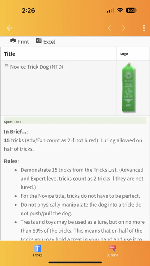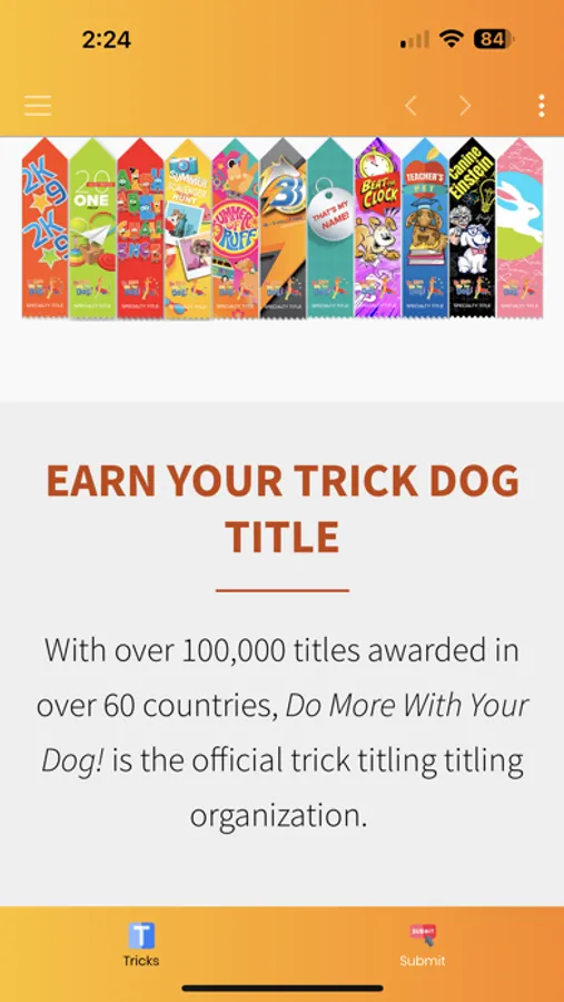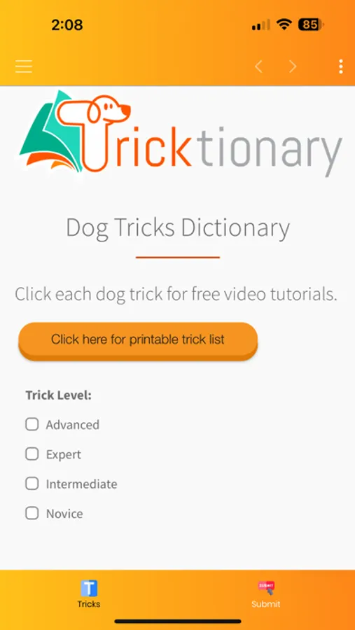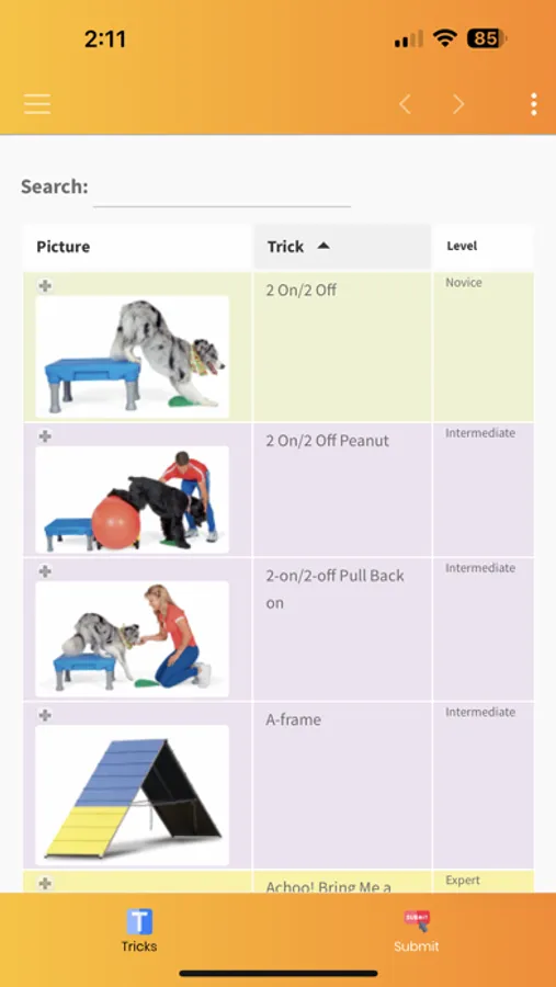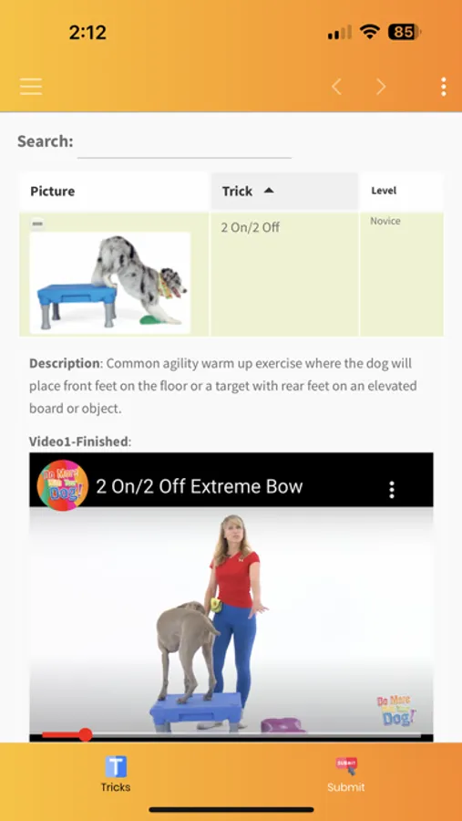 Teach your dog a new trick! The Tricktionary features nearly 300 fun tricks and fitness activities. Each trick has a difficulty level, description, video of the finished trick, and tutorial video. Earn your dog's "Novice Trick Dog" title by using this app to upload video of 15 Novice level tricks. Ready for more? We have 44 titles you can earn in sports such as Tricks, Fitness, Stunt Dog live shows, and Animal Acting.