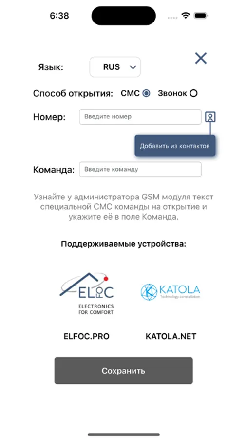In the application settings, You can choose the opening method - Call or SMS. Ask the administrator of the GSM module the text of the special SMS command for opening and specify it in the Number field. Supported models: ELfoC C1, ELfoC C2, ELfoC B1, ELfoC B2, KATOLA US200-1, KATOLA US200-2, KATOLA US1000-1, KATOLA US1000-2