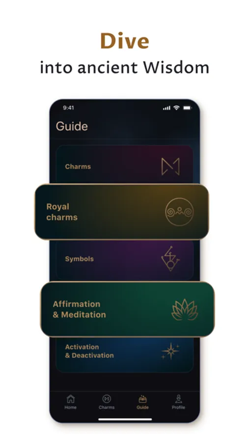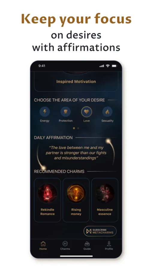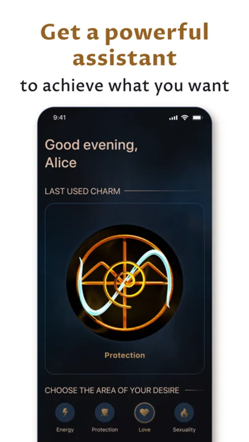 Application works on transformation of imagination and way of thinking to reprogram old beliefs through affirmations and activate persone to achieve what they want.The information encrypted in the charm works on the principle of code, which, with regular interaction (affirmation). Charms have different functions: some help in business like launching a successful project or an effective marketing campaign, find peace of mind and balance, find a life partner, maintain existing relationships with a partner, get powerful protection, return debts or investments, willand be filled with the strongest energy (for women - beauty, sexual attractiveness and charm, for men - inner strength and libido).
