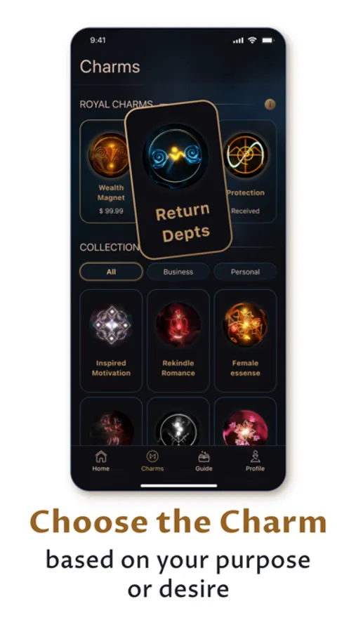 INTERACTION WITH CHARMS: you can choose amulets from the collection and activate it to start focusing on your aims. Charms are divided into two sections - Personal and Business. Personal section presents charms for love and passion, for personal growth and harmonization, for health, body balance and protection.