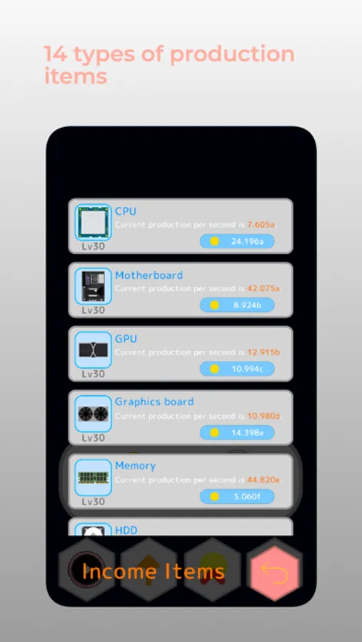1. 14 types of production items: With the factory's automation, 14 idle items are operational, each capable of earning money and supporting the manufacturing process efficiently. Upgrade these items to improve production capacity.