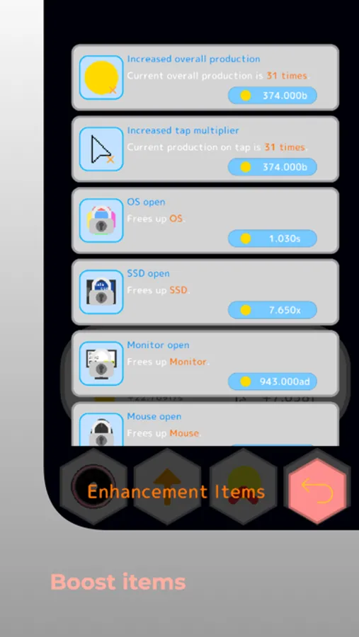 2. Boost items: To further accelerate production in the factory, we also offer boost items. These items have various effects, such as increasing production output or enhancing production through tapping. Use them wisely to aim for the factory's development.