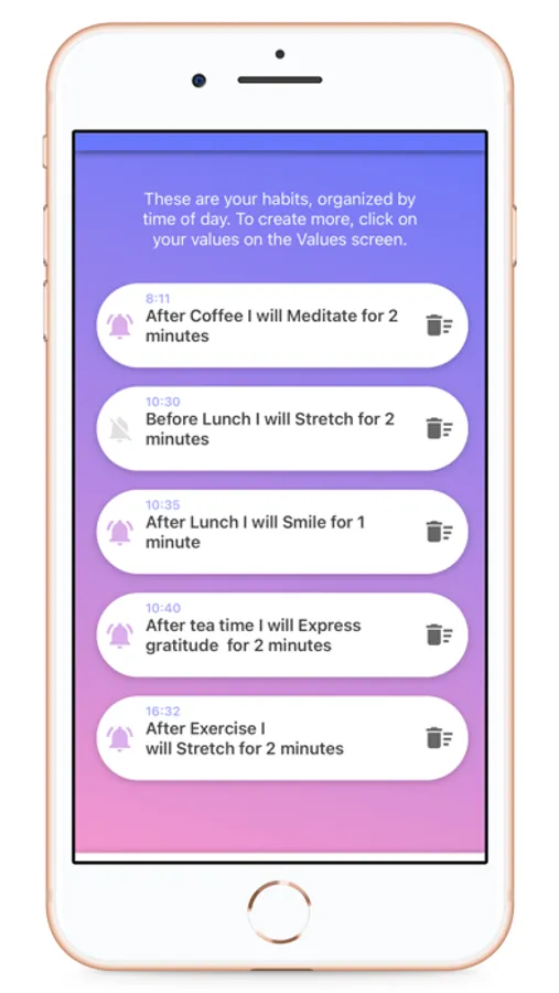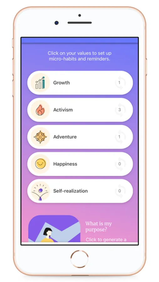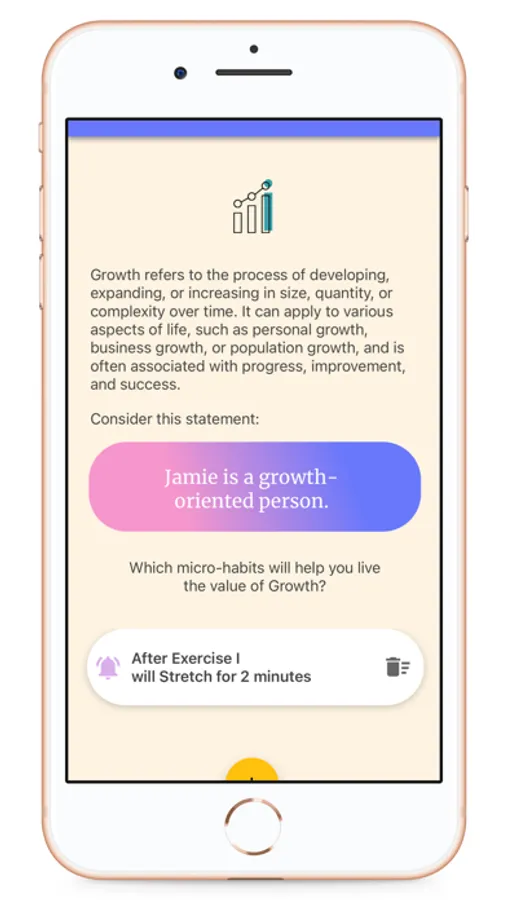 For instance, if "Kindness" is a core value, you can set up micro-habits to embody the identity of "Kind Person." With daily reminders for each of your scheduled micro-habits, you'll develop habits that nurture your values in your everyday life.