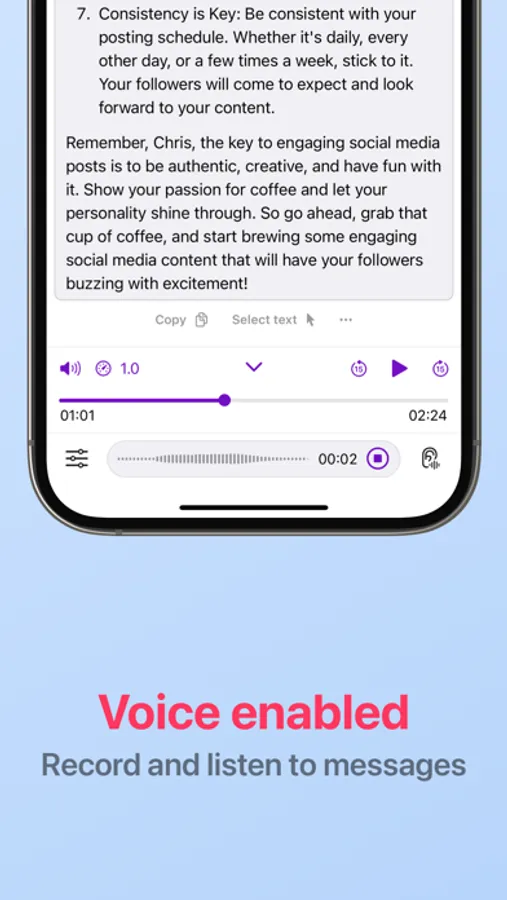 Record a quick voice message to increase chat speed and stay on the go. Powered by state of the art, automatic, human-level transcription for the best accuracy.