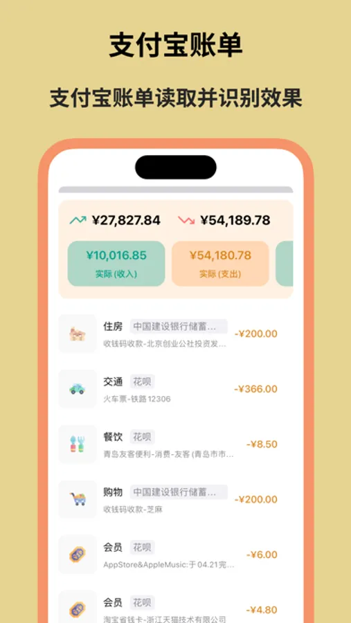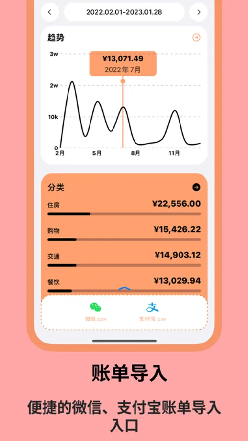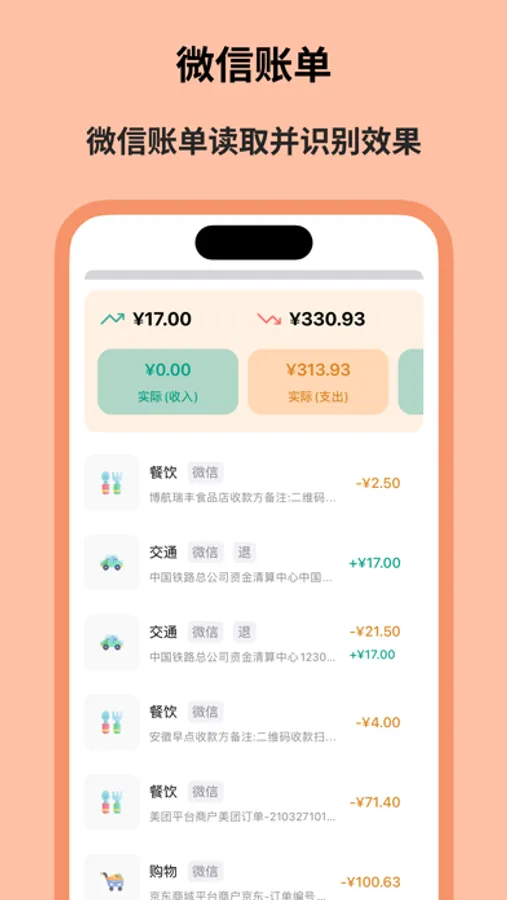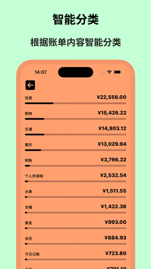 2.智能分类:根据账单内容智能的进行分类,比如美团外卖识别为餐饮