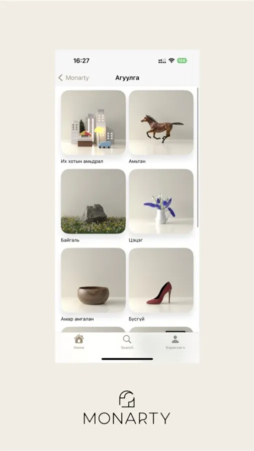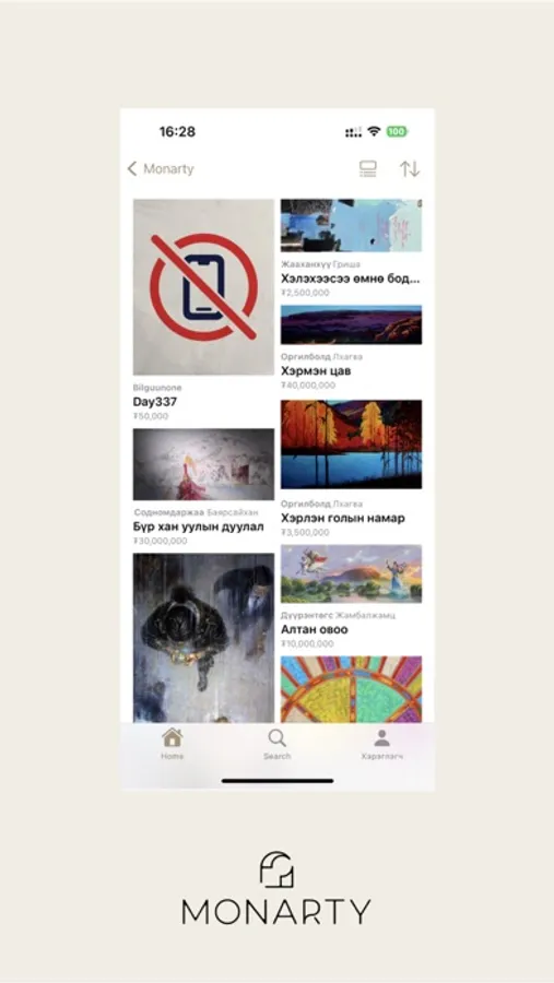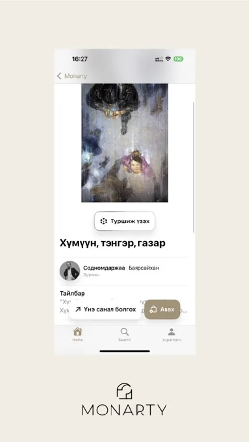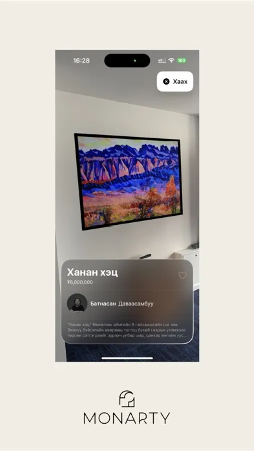 Та гэртээ, оффистоо энэ зураг ямархуу харагдах бол гэж бодож байсан уу? Монарти аппликэйшнд байгаа бүтээл бүрийн дор байх “ТУРШИЖ ҮЗЭХ” хэсэгт даран тухайн урлагийн бүтээлийг ханандаа байршуулж үзэх боломжтой. Утасны камерыг ханаруугаа харуулан барьснаар тухайн бүтээл бодит өнгө, хэмжээгээр харагдах болно. Ингэснээр та сонирхсон зургаа хэмжээ таарах эсэхийг шалгаж, хэрхэн харагдахыг турших боломжтой.