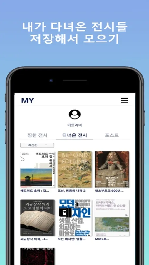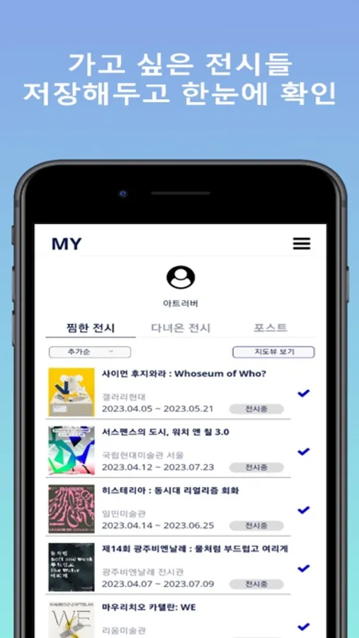 - 저장된 전시는 마이 페이지에서 확인할 수 있고, 원하는 대로 순서를 정렬하여 방문을 계획해볼 수 있어요.