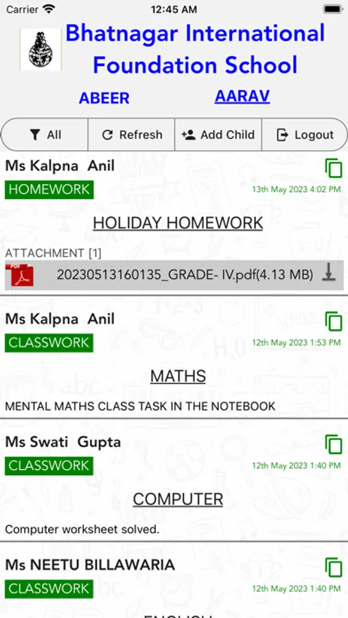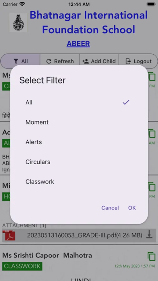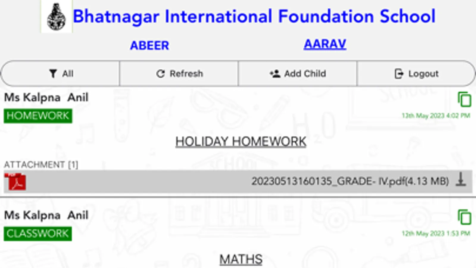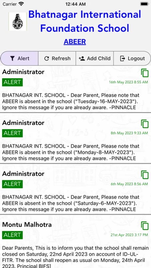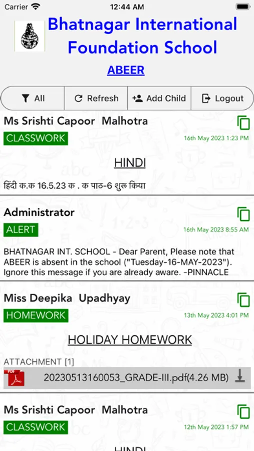 First version that support login and showing alerts and Circulars to users. At a given time two parents can login.