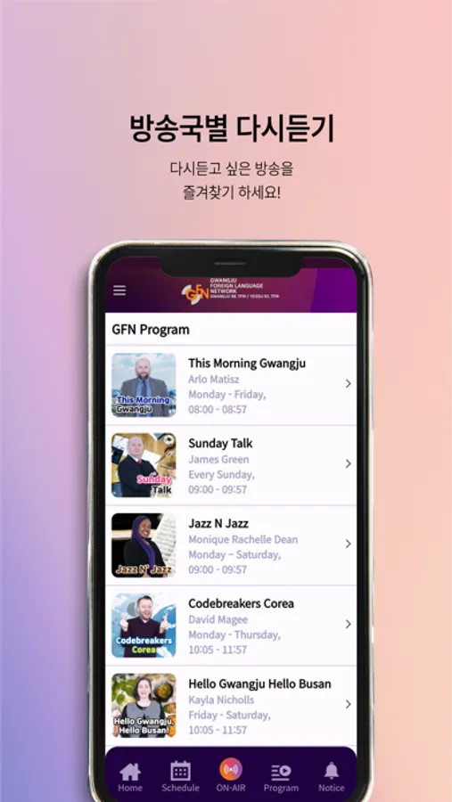 GFN Program: 광주영어방송에서 자체 제작하는 프로그램 소개, 다시듣기 서비스를 제공합니다.