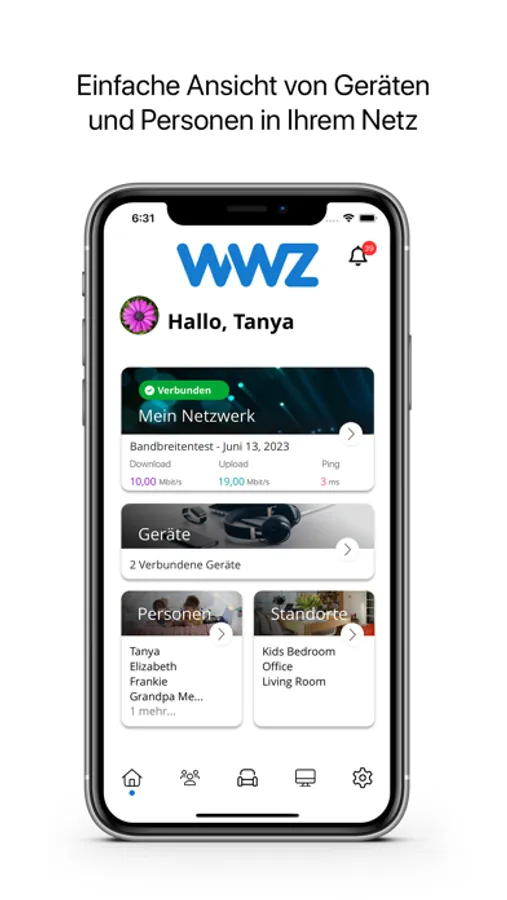 WWZ CommandIQ ermöglicht Ihnen jeden Aspekt Ihres Heim-Netzwerks anzuzeigen und zu verwalten. Dies beinhaltet die Einrichtung der Kindersicherung, Erstellung von Gastnetzwerken und Durchführung von Geschwindigkeitstests. Sie sehen alle mit dem Netzwerk verbundenen Geräte und können die Netzwerknutzung überwachen.