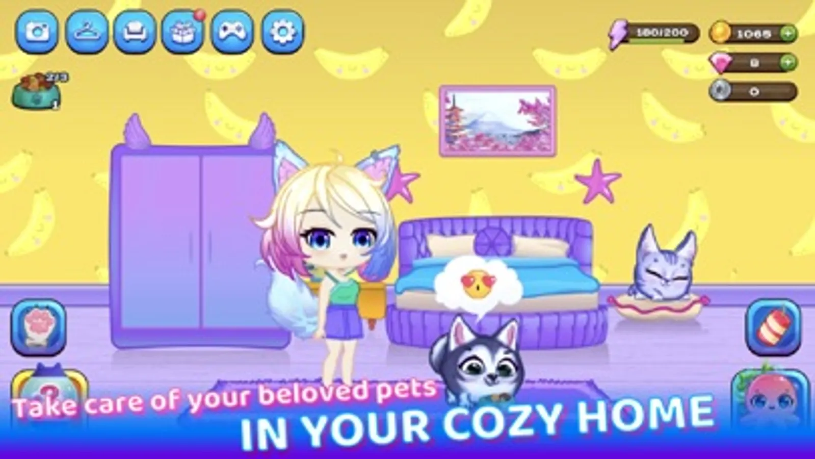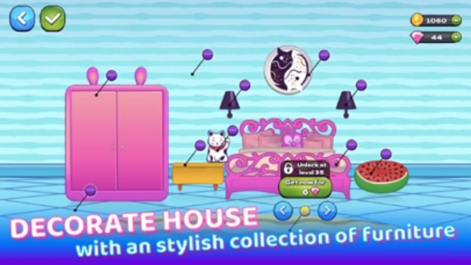 Spin the gachapon to get new funny pets! Create unique, beautiful and cute interiors where your girl and fluffies will live!