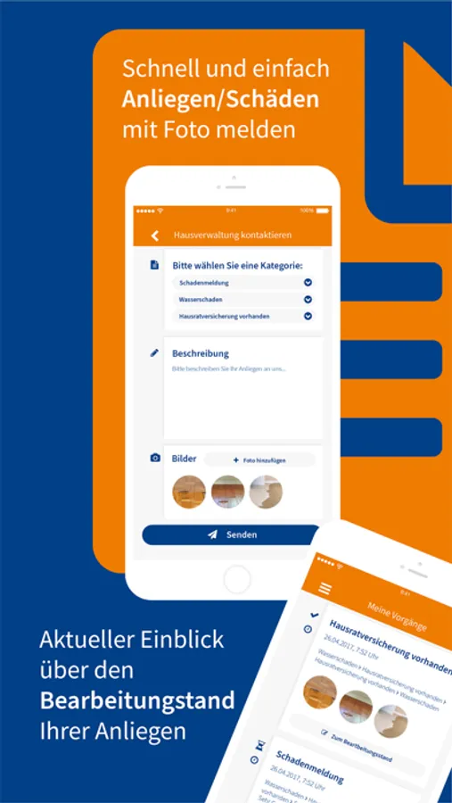 Als Mieter oder Eigentümer können Sie Schäden oder Anliegen direkt mit Fotos über unsere App melden. Ihre Anfragen stehen unseren Mitarbeiten dann zur Verfügung und können auch an Handwerksbetriebe weitergeleitet werden.