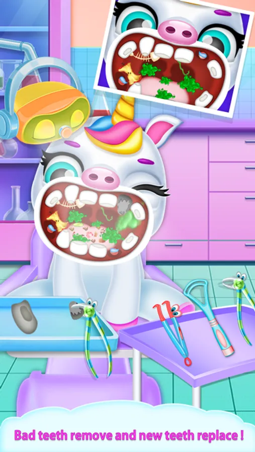 Your baby unicorn likes to be super clean! Hygiene baby's teeth with amazing dentist tools .