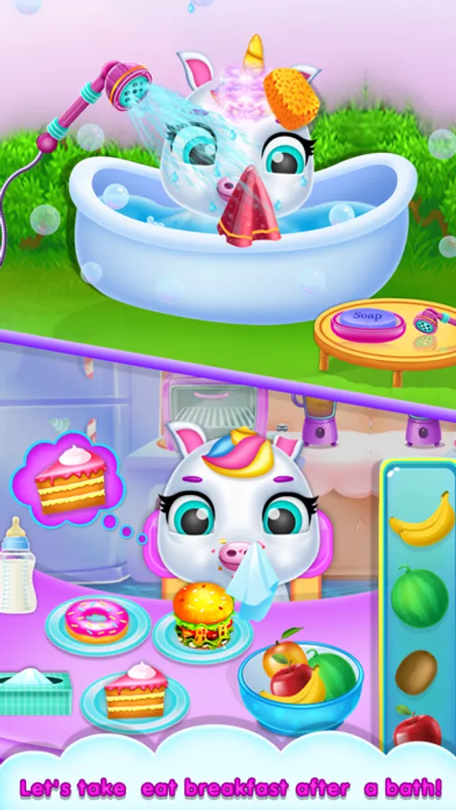 Watch your virtual unicorn grow ,Take good care of the little baby unicorn : feed, bathe, dress up and play!
