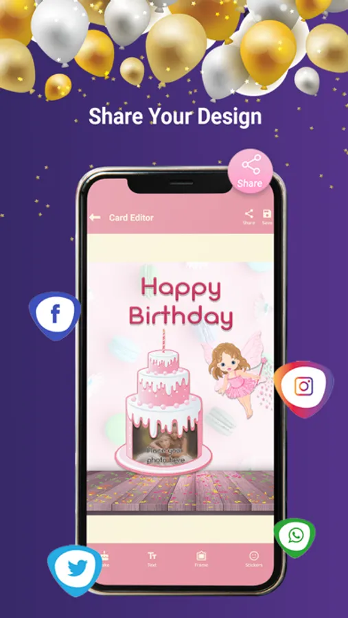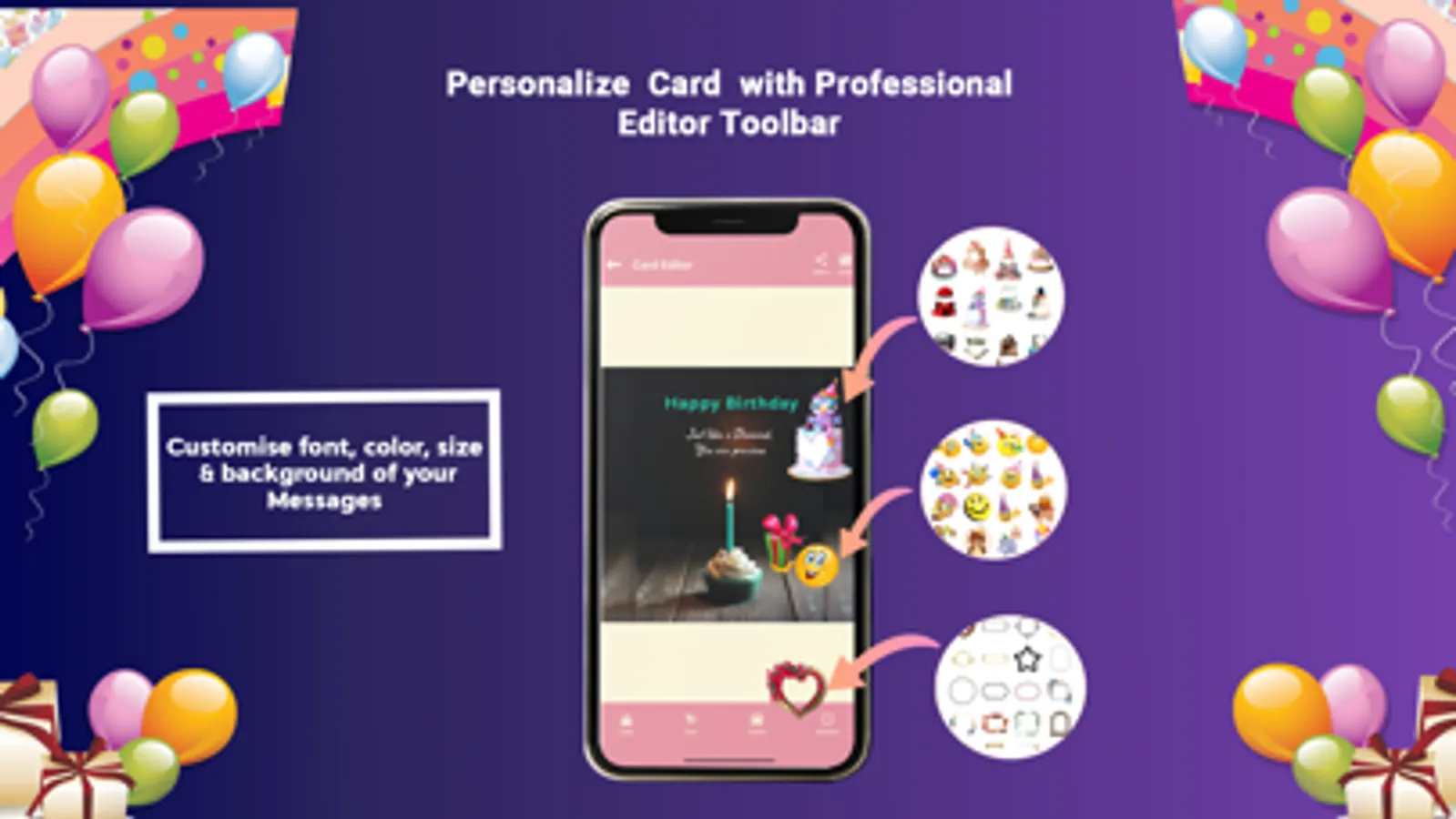 Improve the quality of creation using editor tools with AI technology to enhance cards & frame with better color and contrast. Use overlays, apply blur, text, crop, rotate birthday frames for photo editing, happy stickers like balloons, cakes, stars, heart, gifts countdown and. Last but no least you can also take pic for gallery and edit it. Share your creation with your family, friends and save card in Album so that you can send as you get reminder.