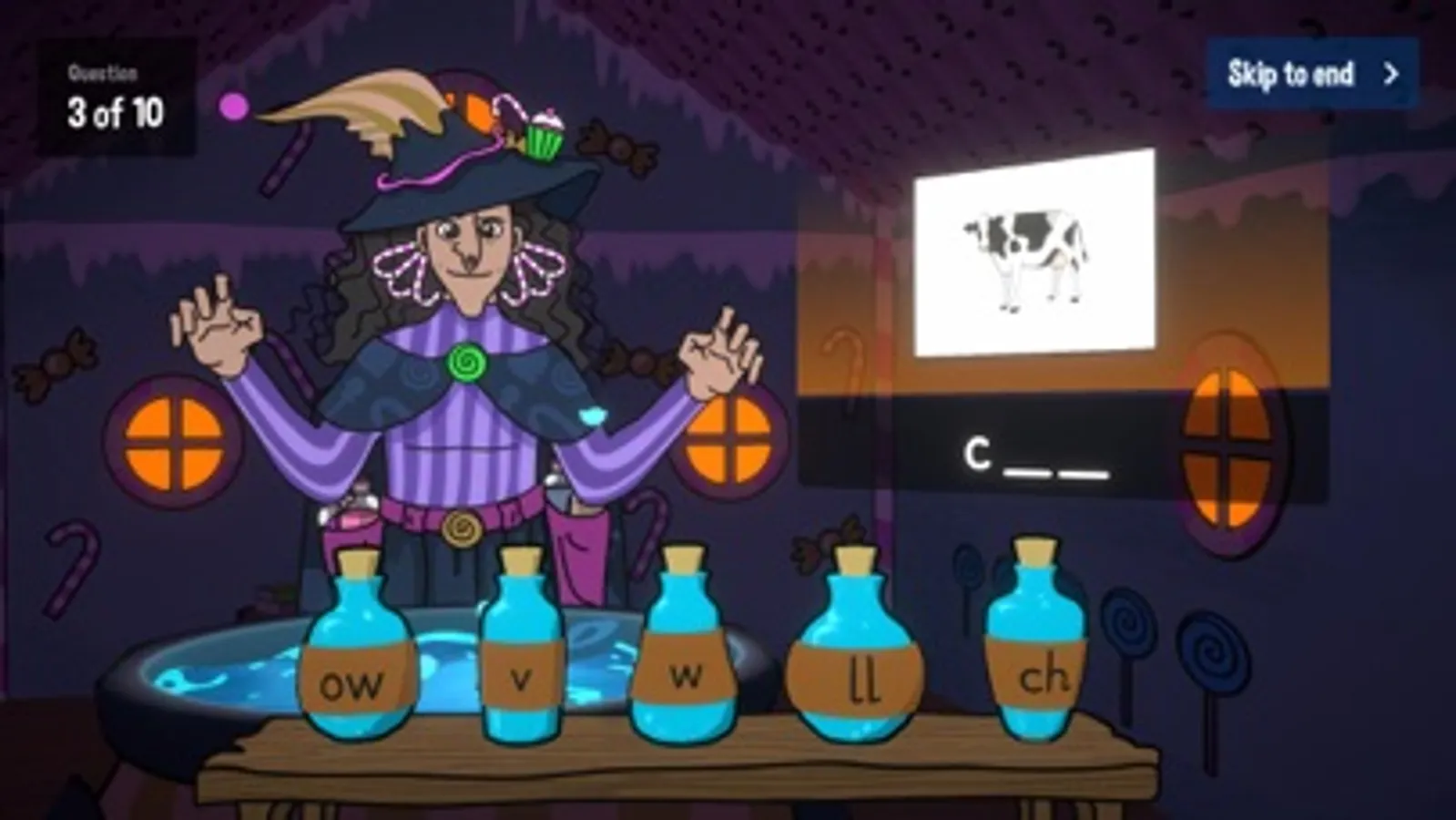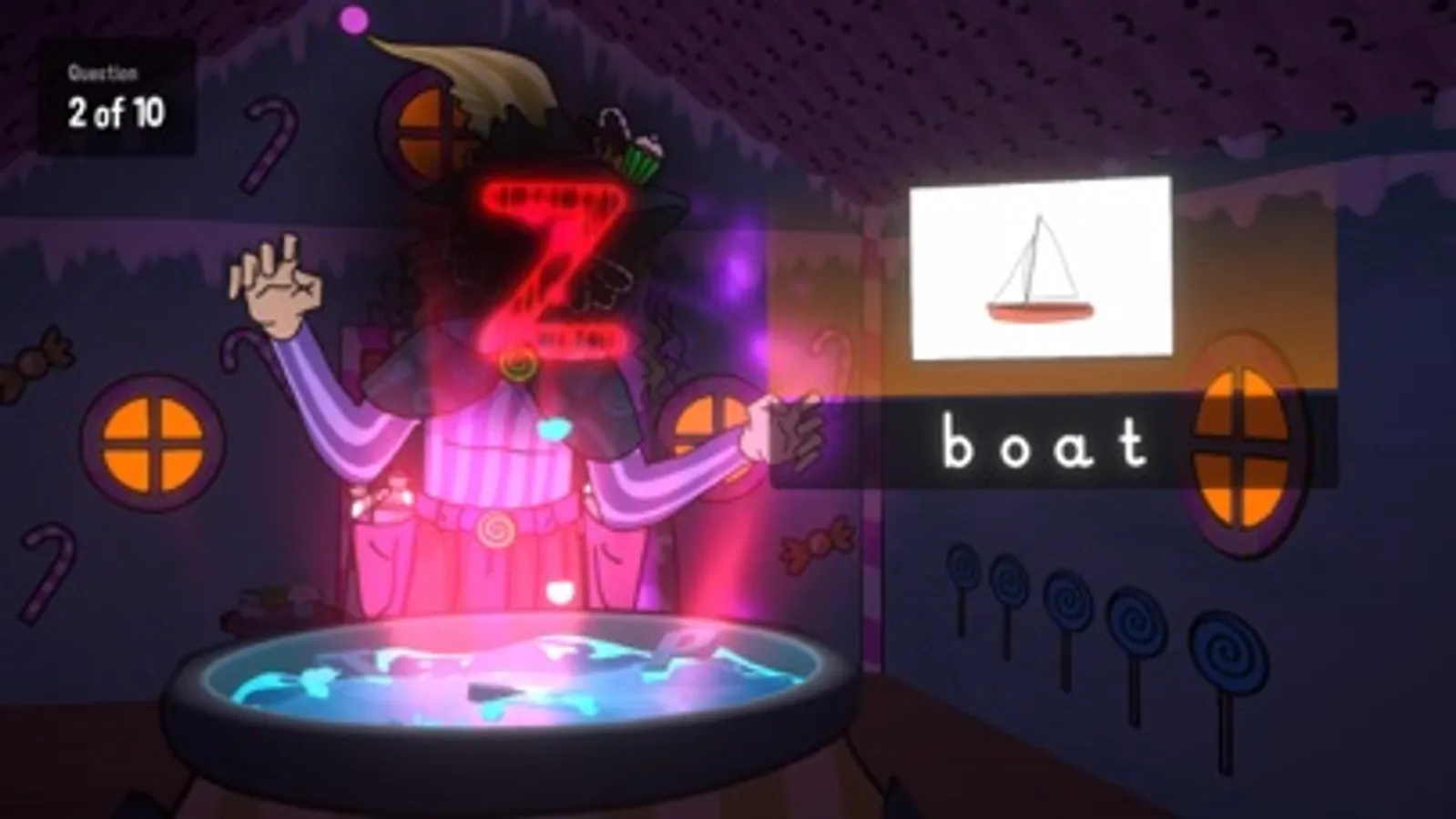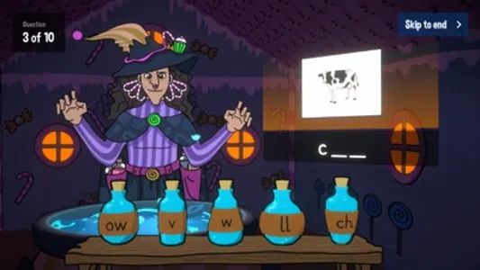 Kids will love this fun take on the classic fairy tale of Hansel & Gretel! Instead of working out the correct number of coins to make a given amount of money, you must correctly identify the missing sound in a series of given words! You are shown an image of an object, and the name of that object (with a missing letter), and must choose from a selection of 5 answers, represented by potions. Make sure you add the correct potions into the cauldron, or else it'll become unstable and explode!
