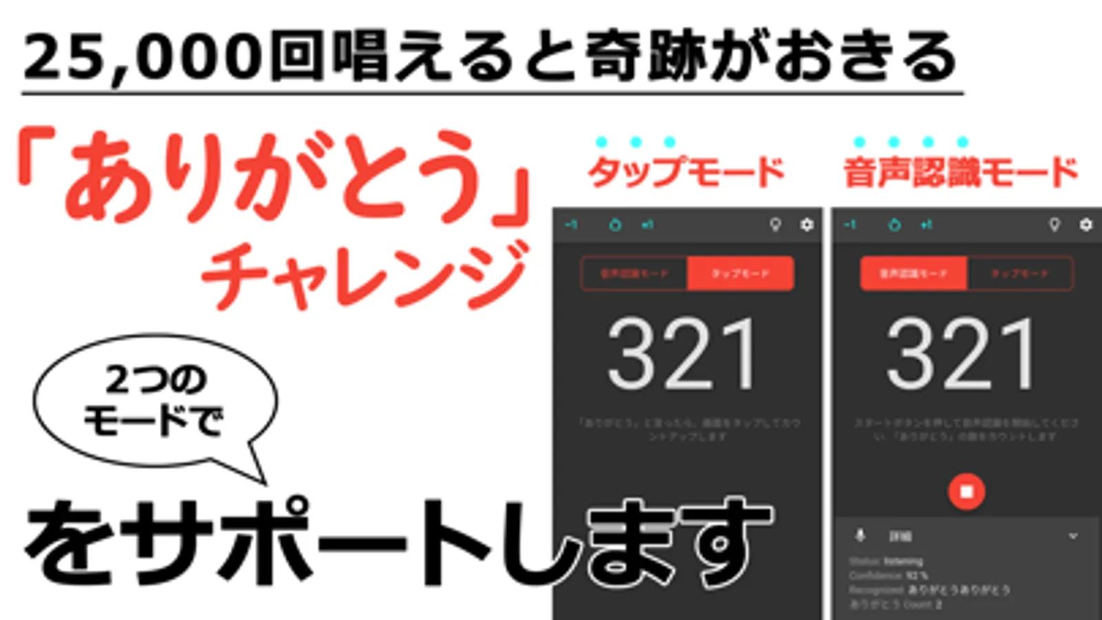 「ありがとう25000回チャレンジ」をサポート!音声認識とタップカウンターの2つの機能で「ありがとう」の数をカウントします.