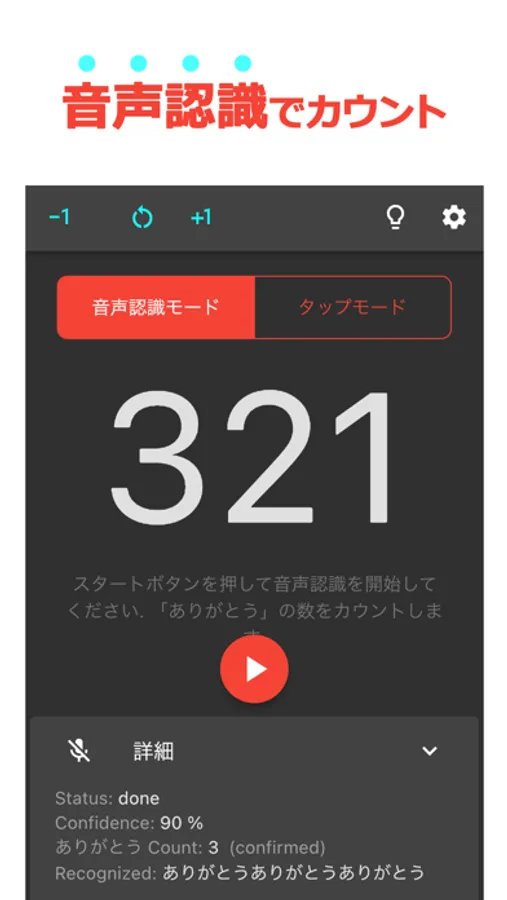 ●音声認識モード…音声認識を使用し「ありがとう」の言葉をハンズフリーでカウントします