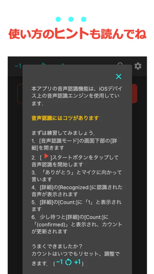 画面上部のアイコンでカウントを調整できますが、「音声認識とはこんなもの」と考え、おおよその値でOKな場合、利便性を求める場合にご使用ください.