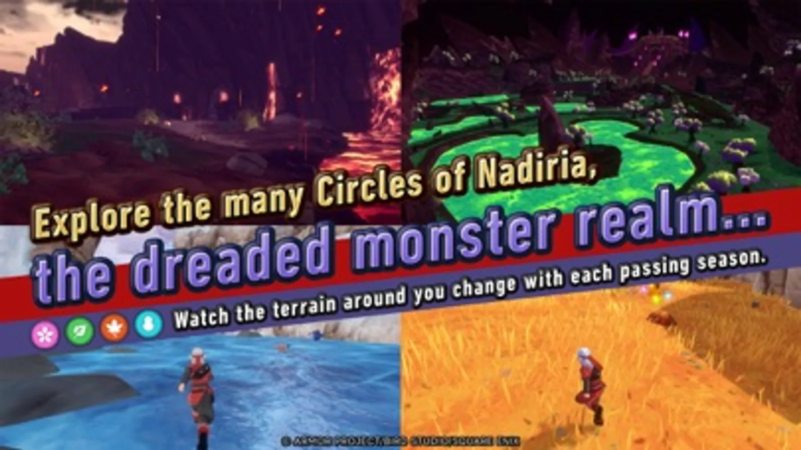 On his quest for greatness, Psaro will traverse the multifarious Circles of Nadiria. Whether it be made entirely of cake and sweets or fraught with rivers of bubbling lava, each Circle plays host to a wealth of bewitching adventures. As time passes in Nadiria, so too do the seasons change, with different weather conditions tempting new monsters out of hiding and revealing paths to undiscovered areas. The Circles of Nadiria are sure to provide a fresh experience every time you visit.