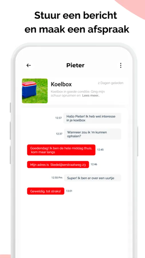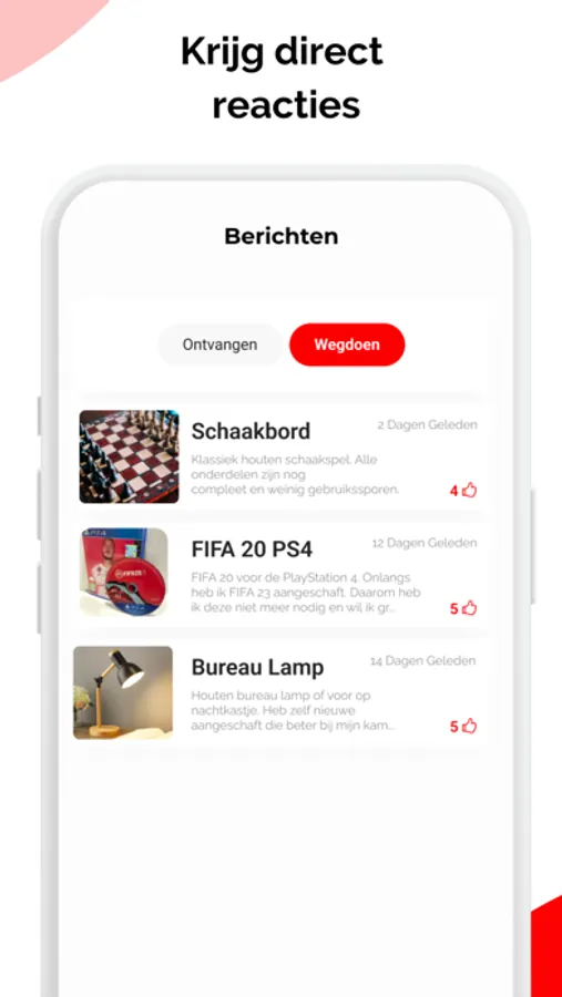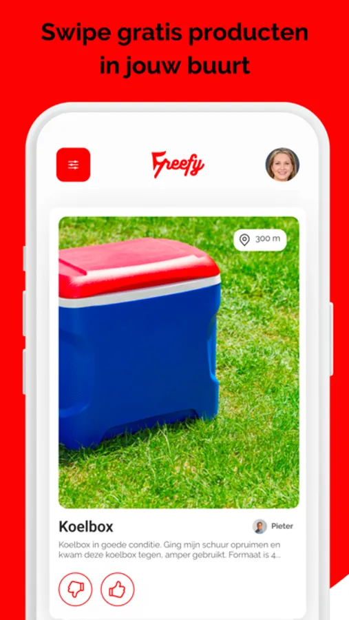 Onze app is heel eenvoudig te gebruiken. Verveel jij je? Kijk naar de beschikbare producten en swipe rechts als je iets leuk vindt. Dan kun je gemakkelijk een bericht sturen om het product op te halen. Op onze app filter je makkelijk op categorie. Denk aan meubels, elektronica, boeken, spellen of kleding. Zo vind je nog sneller het gratis product wat jij zoekt.