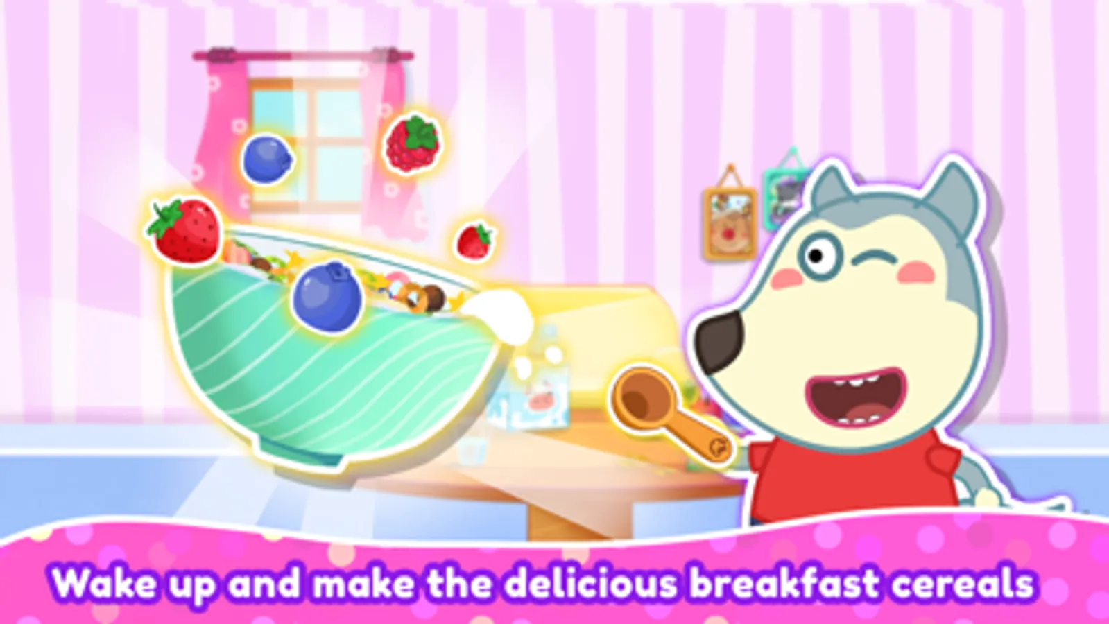 Help Wolfoo clean his teeth - Cook a delicious breakfast with cereal - Clean up the room - Feed the fish