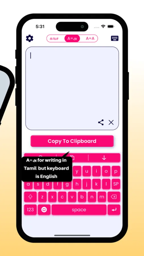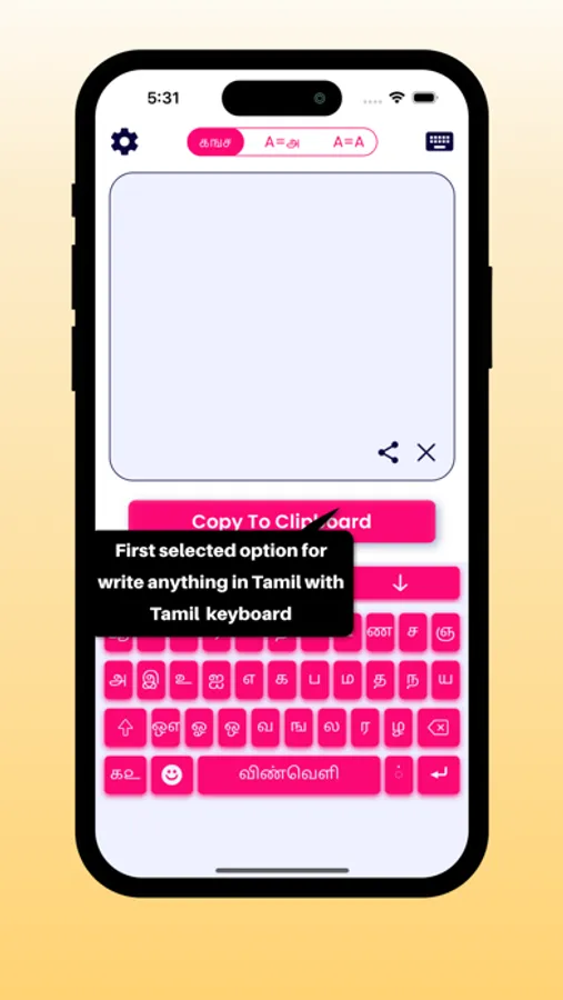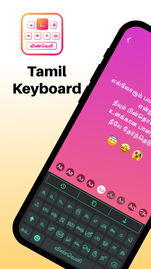 Easy and fast Tamil typing is the first priority of this Tamil Keyboard. Besides direct Tamil typing pad, it also supports phonetic avro style typing. This keyboard helps you typing Tamil very fast with Tamil letters with A = Tamil latter .