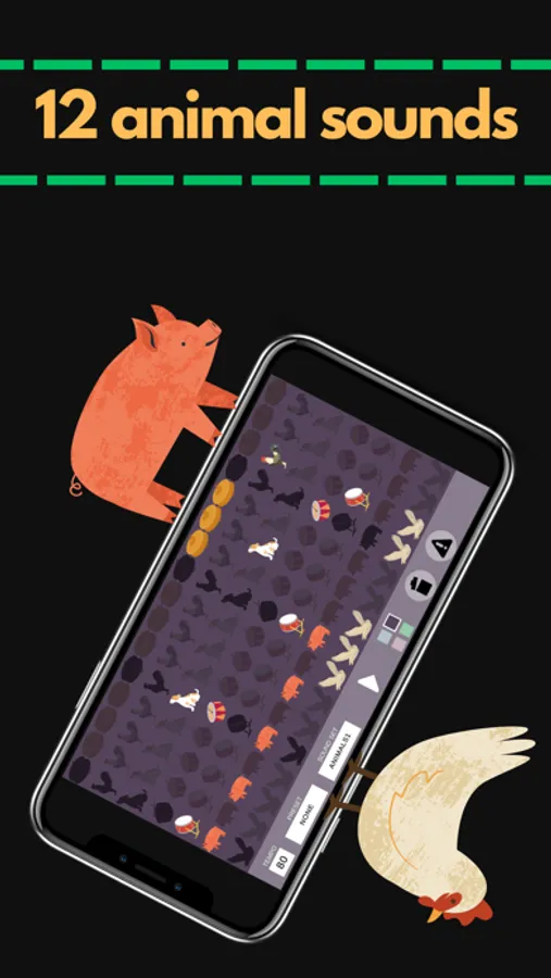 This Drum machine contains 12 animal sounds and 3 drum and cymbal sounds.