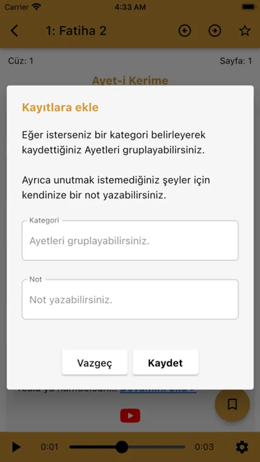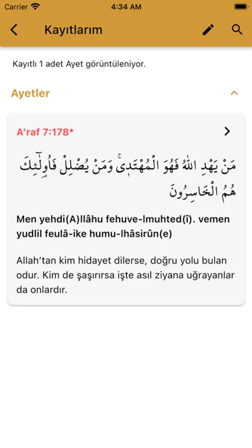 Hızlıca ulaşmak istediğiniz Ayet-i Kerimeleri; ilgili Ayet sayfasının sağ üstünde bulunan yıldız butonu ile kayıt edebilirsiniz. Ayrıca her bir Ayet-i Kerime için kendinize not yazabilirsiniz.
