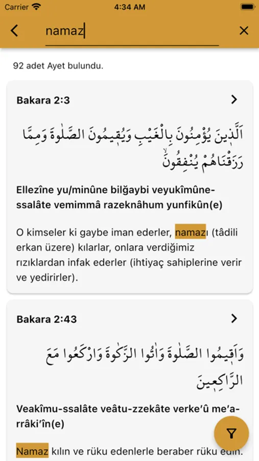 Kur’an-ı Kerim içerisinde bulmak istediğiniz herhangi bir kelimeyi aratabilirsiniz; örneğin 'namaz' ve 'oruç' gibi. Aradığınız kelimenin geçtiği tüm Ayet-i Kerimeler anında listelenecektir. Ayrıca Ayet-i Kerimelerin Arapçasını Latin harfleri ile de aratabilirsiniz.
