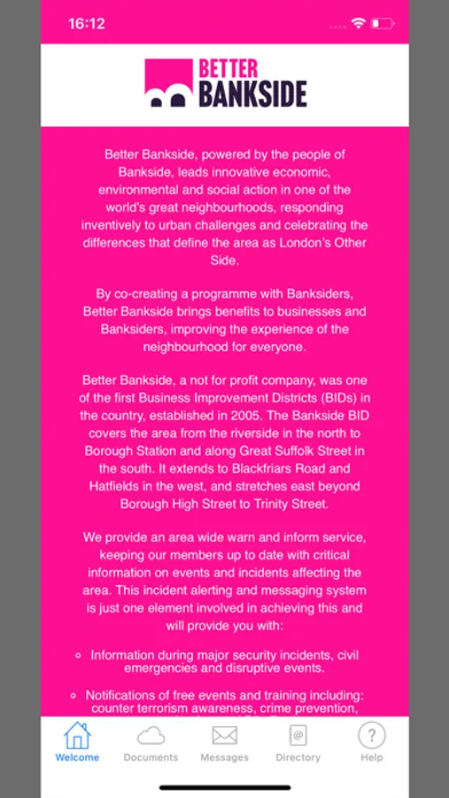 Better Bankside is the local Business Improvement District for the Bankside neighbourhood. Tasked with supporting the businesses within the area one of our core focusses if ensure the safety and resilience of our community. This incident alerting and messaging system is just one element involved in achieving this, providing businesses and their staff with: